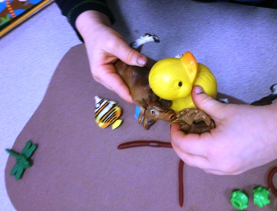 One Stuck Duck is a story where the same event recurs with different characters. To introduce story recall for this book, we gave the children all of the materials at once. We used a piece of construction paper for the muck and placed the corresponding animals in the correct amounts around the muck. We also placed a copy of the book in the center for children to reference as needed. If you are unable to locate all of the animals from the story, you can recreate the same activity with printed images on the table top or felt board.