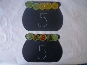 Place any leftover green and gold coins in a black plastic bowl or pot. Let children use the coins to make patterns, such as ababab, aabbaabb, abbaabba, etc. Take photographs of their completed patterns and post them in an area of the room where they can be referenced to name and copy the patterns shown.