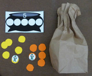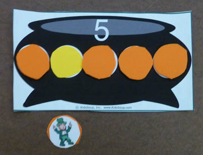 Each player gets a Pot of Gold Play Mat and a Pot of Gold Recording Sheet. Explain that the leprechaun has hidden his gold coins inside the paper bag. Taking turns and without looking, each player pulls a gold coin from the lunch bag and places it on his/her Pot of Gold Play Mat. If the player pulls out a leprechaun, he/she has to return all of his/her gold coins to the bag. The leprechaun circle will get discarded. The game ends when both players have placed 5 gold coins on their mats. Have children compare their coins (i.e., two yellow coins and three orange coins, four orange coins and one yellow coin, five yellow coins and zero orange coins, etc.)