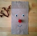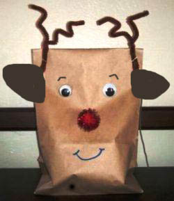 Twist pipe cleaners into antlers. Cut out ears from brown craft paper. Glue eyes, ears, and puff ball "nose" to bag. Draw on mouth. Once glue dries, fold the top of the bag to the back and staple the antlers to each side.