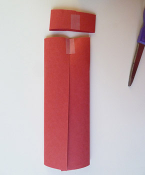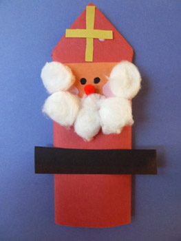 For the arms, cut another strip out of red craft paper that is longer then Sinterklaas' width and glue it to the back. Add some orange hands.