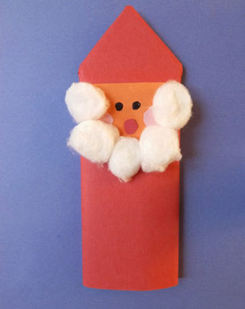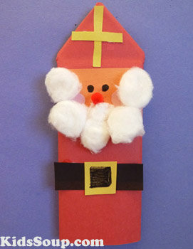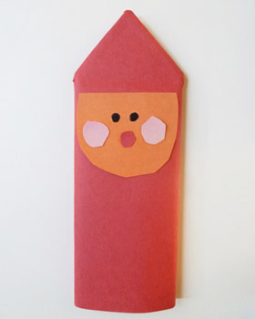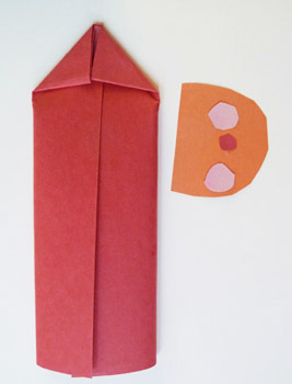For Sinterklaas' face draw a half circle, the width of the folded red craft paper, on the orange craft paper. Cut out. Decorage with a nose, eyes, and cheeks and glue on the front of the Sinterklass body.