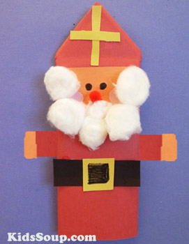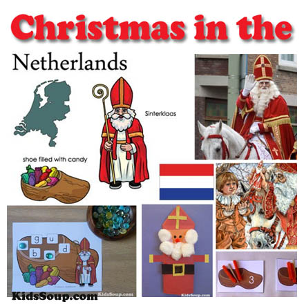 Dutch children in Holland, or the Netherlands, anxiously look forward to St. Nicholas Day on December 6. They eagerly await the arrival of Sinterklaas. Sinterklaas is a kindly bishop. He wears red robes and a tall, pointed mitre on his head. With him he brings his white horse and a huge sack full of gifts for the children. Children leave out a shoe for Sinterklaas to fill with candies.
