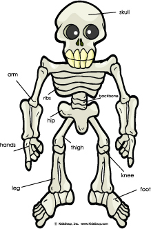 Together look at the picture and name and describe the different bones of the skeleton. Sing the song Skeleton Dance:
